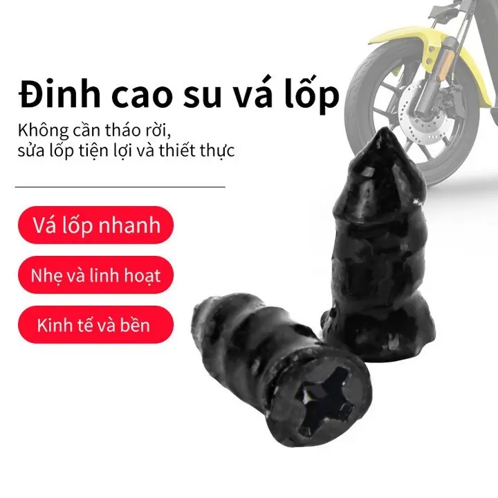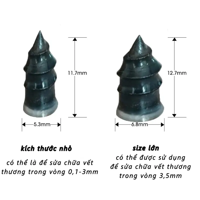 - Vá Được Mọi Kích Cỡ Lỗ Thủng Nhỏ Đến Vừa: Từ những vết đâm nhỏ li ti 0.1mm cho đến lỗ thủng 5mm, đinh cao su của chúng tôi đều xử lý được, giúp bạn tự tin trên mọi cung đường.
