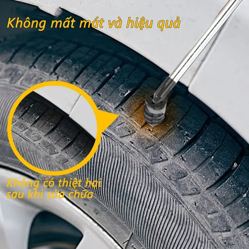 - Vá Lốp “Thần Tốc” Trong 1 Phút: Thủng lốp? Chỉ cần lấy đinh ra, vặn nhẹ vào lỗ thủng là xong! Lốp sẽ kín hơi ngay lập tức, bạn có thể tiếp tục hành trình an toàn mà không tốn một giây chờ đợi nào.